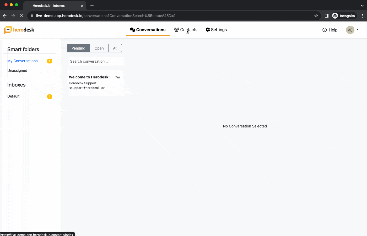 Du kan starte nye samtaler med enhver kontakt, der findes i din Herodesk. Nye samtaler sendes altid til kontakten via e-mail. Når kontakten svarer, lander beskeden i din Herodesk-indbakke og behandles som enhver anden samtale.